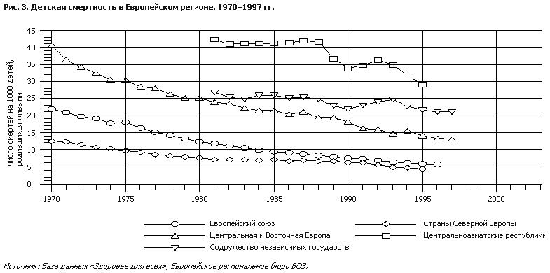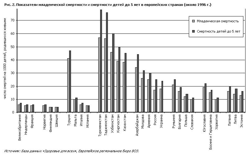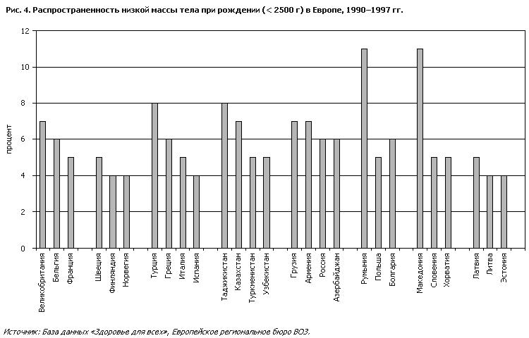 На рис. 2 показаны большие различия в уровнях младенческой смертности и смертности детей до 5 лет между странами Европейского региона – от наивысшего показателя в ЦАР, особенно в Таджикистане и Туркменистане (более 55 и 75 на 1000 детей, родившихся живыми, для грудных детей и для детей до 5 лет соответственно), до наименьшего показателя в таких странах Северной Европы, как Финляндия и Швеция (5 на 1000 детей, родившихся живыми, по обеим возрастным категориям). Показатели смертности в странах Центральной и Восточной Европы и в балканских странах находятся между этими двумя крайними уровнями и составляют примерно 10–20 на 1000 детей, родившихся живыми. В странах с высокими показателями смертности разница в смертности грудных детей и детей до 5 лет относительно велика. Напротив, в Финляндии и Швеции она практически равна нулю: это указывает на то, что после первого года случаев смерти бывает очень мало. Начиная с 70-х годов младенческая смертность в Регионе неуклонно снижается (рис. 3). Однако в то время как средние показатели для Европейского Союза и стран Северной Европы сократились соответственно с 22 и 13 случаев смерти на 1000 родившихся живыми детей в 1970 г. до 5 в 1995 г., в СНГ и особенно в ЦАР эти цифры по-прежнему значительно выше, чем на остальной территории Региона. Если в западноевропейских странах основными причинами младенческой смертности являются врожденные пороки, травмы и «смерть в колыбели» (синдром внезапной смерти внешне здорового ребенка), в странах с высокими показателями смертности такие случаи смерти вызываются главным образом инфекционными заболеваниями. Плохое состояние питания ослабляет иммунную систему детей раннего возраста и делает их более восприимчивыми к инфекциям, в особенности к инфекциям, поражающим дыхательные пути и желудочно-кишечный тракт. В Азербайджане, например, смертность от респираторных заболеваний составляет 24,5 на 1000 детей, родившихся живыми, тогда как в Словакии этот показатель составляет лишь 1,5 (Данные из базы данных “Здоровье для всех”, Европейское региональное бюро ВОЗ.). В ЦАР грудные дети болеют острыми респираторными инфекциями, диарейными заболеваниями, а также такими заболеваниями, поддающимися вакцинной профилактике, как туберкулез: семь из десяти случаев смерти вызываются этими болезнями, а часто и их комбинациями. На долю острых респираторных инфекций среди детей до 5 лет (в частности, пневмонии) приходится от 30 до 50% всей детской смертности. Респираторные заболевания являются главной причиной смертности детей также в Болгарии и Федеративной Республике Югославия (4). развитие плода, грудного ребенка и ребенка раннего возраста низкая масса тела при рожденииНизкая масса тела при рождении определяется как масса тела при рождении менее 2500 грамм. Она является следствием либо преждевременных родов, либо задержки внутриутробного развития, что может быть связано с плохим состоянием питания у матери. На рис. 4 показана распространенность низкой массы тела при рождении на территории Европейского региона. К удивлению, по сравнению со странами Западной Европы значительно более высокой распространенностью (11%) характеризуются только Румыния и Бывшая Югославская Республика Македония. Например, в Болгарии и Польше распространенность ниже (6% и 5% соответственно), чем в Соединенном Королевств