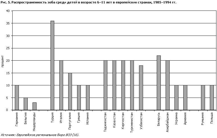йод Определение слабой, умеренной и тяжелой степени недостаточности йода (таблица 3 – Источник: Европейское региональное бюро ВОЗ (16)) основано на комбинированной оценке четырех разных показателей: зоб у детей школьного возраста, увеличение объема щитовидной железы выше 97-й центили, серединной величины йода в моче у школьников и взрослых и распространенность содержания тиреотропного гормона у новорожденных выше 5 µU/мл цельной крови (16). Как показано в таблице 4, йододефицитные расстройства остаются распространенными в Европейском регионе. Существуют хорошо заметные различия в степени успеха вмешательств системы здравоохранения с целью ликвидации проблемы. В странах Северной Европы йододефицитные расстройства практически ликвидированы путем сплошного йодирования соли. Напротив, в республиках Центральной Азии, других бывших советских республиках, странах Центральной и Восточной Европы и в Турции все еще встречаются умеренные уровни распространенности этих расстройств. Более того, в Албании и Таджикистане отмечаются тяжелые или критические уровни. Обследования распространенности зоба среди детей школьного возраста от 6 до 11 лет, проведенные в ряде европейских стран (рис. 5), показывают, что самая высокая распространенность зоба имеет место в Турции, Беларуси, Азербайджане, Центральноазиатских республиках и даже в Италии. Такие высокие показатели распространенности зоба должны рассматриваться как приоритетная проблема системы здравоохранения, и для ее решения необходимо принимать меры. В бывшем Советском Союзе практиковалось сплошное йодирование соли (см. главу 5). Однако после распада страны предприятия по йодированию соли перестали функционировать. Хотя вопрос о йодировании соли стоит в повестке дня системы здравоохранения большинства бывших советских республик, он не всегда решается на практике. Для оценки эффективности политики йодирования можно использовать критерий выведения йода с мочой; например, в Бывшей Югославской Республике Македония выделение йода с мочой в результате йодирования соли увеличилось до нормальных уровней. В 1998–1999 гг. в Европейском регионе ВОЗ было проведено широкое изучение ситуации (17).