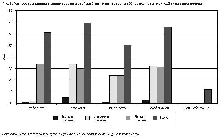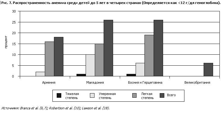 В Европе информация о распространенности недостаточности железа среди детей ограничена. В ходе большинства исследований изучалась лишь распространенность анемии, обычно путем измерения уровней гемоглобина, а не ее этиология, хотя наиболее частой причиной может быть недостаточность железа. Сравнение еще больше затрудняется тем, что используются разные возрастные группы. В то время как одни исследования проводятся только среди детей до 3 лет (рис. 6), в других исследованиях возрастные рамки увеличиваются до 5 лет (рис. 7). Наивысшая степень распространенности анемии отмечается в Центральноазиатских республиках, где уровень гемоглобина ниже 12 г/дл крови был более чем у половины детей до 3 лет (рис. 6). Следует, однако, отметить, что лишь малая часть случаев анемии относилась к категории тяжелых (уровень гемоглобина ниже 7 г/дл). В Западной Европе среди детей этого возраста анемия встречается реже; например, в Соединенном Королевстве среди детей в возрасте 1–2 года степень распространенности составляла 12%, а среди детей от 2 до 4 лет – 6%. В обследовании, проведенном в Соединенном Королевстве, использовалась пороговая точка 11 г/дл крови; по этому критерию, анемия имеется у 10–30% детей дошкольного возраста, живущих в центральных частях городов Соединенного Королевства (20). Распространен– ность же среди репрезентативной для всей страны выборки детей азиатского происхождения, живущих в Соединенном Королевстве, была значительно выше этого уровня (от 20 до 45%) (18). Анемию вызывают и другие факторы, кроме недостаточности железа. В Узбекистане обследование 243 детей в возрасте до 5 лет показало, что у 72% из них была анемия, но только у 2% из них анемия, по-видимому, была не связана с питанием (была вызвана инфекциями и хроническими заболеваниями). В 40% случаях анемия ассоциировалась с низким статусом как железа, так и витамина А; в 10% случаев она ассоциировалась только с недостаточностью железа, а в 20% – только с недостаточностью витамина А (21). Данные о потреблении продуктов питания в Российской Федерации свидетельствуют о том, что высокому риску недостаточности железа подвержены как женщины, так и дети. Основным пищевым источником железа в Российской Федерации являются зерновые продукты, богатые фитатами (22). Более того, ухудшают биологическую доступность пищевого железа отмеченные в сообщениях большие количества потребления чая и малые количества потребления витамина С с овощами и фруктами. Обследование 4077 детей в возрасте до 2 лет показало распространенность анемии, оцениваемой по клиническим признакам, которая колебалась от 2% (Подмосковье) до 16% (Урал). Распространенность уровней гемоглобина ниже 11 г/дл крови была значительно выше и колебалась в пределах от 22% (г. Москва) до 47% (Урал). Средний уровень гемоглобина был значительно выше у детей раннего возраста в городах, чем в поселках и сельских районах: соответственно 12,2 и 11,6 (О. Нетребенко, из личной переписки, 1997). Отмечается недостаточное количество исследований о причинах высокого распространения анемии в легкой и умеренной формах в некоторых частях Восточной Европы, таких, как слишком раннее введение коровьего молока и молочных продуктов, а также чая. Небольшое исследование в Узбекистане, в ходе которого проводились измерения уровней ферритина и гемоглобина, свидетельствует о том, что на 