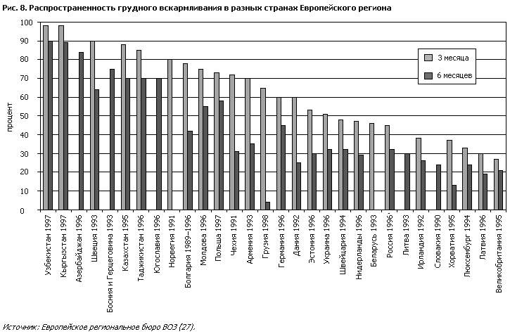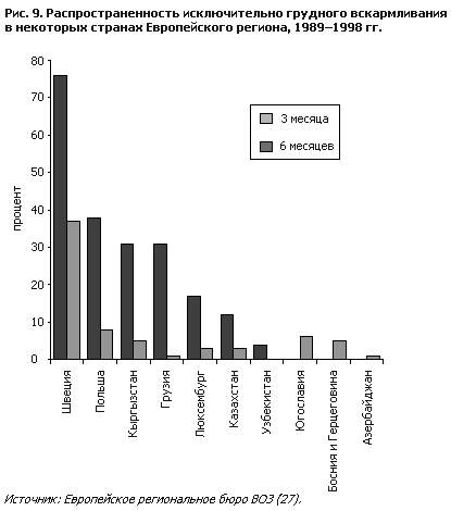 Из-за недостатка всеобъемлющих и сопоставимых данных и унифицированных международных определений какие-либо общие утверждения о распространенности грудного вскармливания в Европейском регионе ВОЗ делать трудно. Данные о проценте детей, находящихся на грудном вскармливании, приведенные на рис. 8, взяты из различных источников (27). К этим данным нужно подходить осторожно: методики обследований были различны, и в некоторых случаях не приводилось описания того, каким образом выполнялись обследования. Но даже и после этих предостережений можно видеть, что практика грудного вскармливания резко различается в разных европейских странах. В Соединенном Королевстве в возрасте 3 месяцев грудью кормятся около 25% детей, а в Узбекистане – более 90%. Тем не менее, распространенность грудного вскармливания в какой-либо стране может значительно измениться за несколько лет. Например, в Норвегии распространенность грудного вскармливания в возрасте 3 месяцев увеличилась от каких-нибудь 25–30% в 1969 г. до примерно 80% в 1965 г. (28). К сожалению, данные, представленные на рис. 8, не отражают процента “исключительно” грудного вскармливания. Определение “исключительно” грудного вскармливания дано лишь в немногих исследованиях, но данные исследований, в которых это определение дается, представлены на рис. 9, где показаны относительно высокие проценты исключительно грудного вскармливания в Швеции в возрасте как 3, так и 6 месяцев. В отличие от Швеции, процент исключительно грудного вскармливания в Центральноазиатских республиках в 3 месяца намного ниже (около 10% и меньше), за исключением Кыргызстана и Грузии, где этот показатель составляет около 30%. Прекрасных успехов добивается Польша: распространен– ность исключительно грудного вскармливания взлетела практически с нуля в 1988 г. до почти 40% в 1997 г. В Российской Федерации в 1996 г. кормление грудью начиналось примерно у 95% детей, родившихся в роддомах (О. Нетребенко, из личной переписки, 1997 г.). Средняя продолжительность колебалась от 3 до 4 месяцев в зависимости от того, когда было начато кормление грудью, и от образовательного уровня матери. Наиболее образованные женщины кормили своих детей грудью значительно дольше, чем женщины с более низким уровнем образования. Распространенность частичного грудного вскармливания составляла около 50% в 3 месяца и около 30% в 6 месяцев. Большинство детей, находившихся на грудном вскармливании, получали также коровье молоко. Распространенность исключительно грудного вскармливания детей в возрасте 4 месяцев в большинстве областей колебалась от 22 до 28%. В Санкт-Петербурге, однако, процент исключительно грудного вскармливания был очень высок (42%), что, вероятно, было результатом более высокого уровня образования и готовности местных органов поддержать осуществление международных рекомендаций в отношении грудного вскармливания (см. главу 7). Исследования, проведенные в республиках Центральной Азии, показывают, что, несмотря на высокую распространенность грудного вскармливания, на исключительно грудном вскармливании находится малый процент детей (рис. 9); более чем в 50% случаев грудное вскармливание после первых 24 часов еще не начиналось. Недостаточное распространение исключительно грудного вскармливания в сочетании с ухудшением социально-экономических условий, загрязн