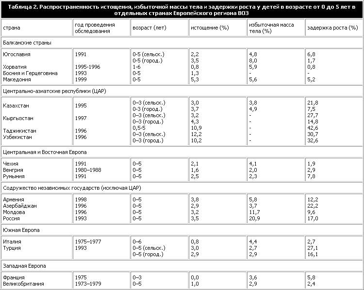 В таблице 2 приводятся европейские данные из “Глобальной базы данных по физическому развитию и нарушениям питания детей” и из обследований населения. Распространенность истощения выше 5% документально отмечена только в Таджикистане и Узбекистане, где она составляет 10–12%. В остальных странах Региона распространенность истощения в целом низка – от 0 и 0,8% во Франции и Италии в 70-е годы до примерно 2–3% в других странах в 90-е годы. Даже среди уязвимых групп населения, таких, как беженцы в Армении и Азербайджане и население в условиях осадного положения в Боснии и Герцеговине (10), данные свидетельствуют о том, что белково-калорийная недостаточность не является распространенной проблемой общественного здоровья. Избыточная масса тела у детей более старшего возраста наблюдается в нескольких странах Региона, в особенности на западе. Например, в результате проведенного недавно обследования британских школьников в возрасте 7–8 лет было установлено, что распространенность избыточной массы тела и ожирения значительно превышает ожидаемый показатель (13). Напротив, в странах восточной части Региона, например, в Армении и в Федеративной Республике Югославии, наблюдается лишь незначительная распространенность избыточной массы тела. Исключением является Российская Федерация, где избыточную массу тела имеют 20% детей раннего возраста – это самая высокая распространенность в Регионе (11). Сравнение данных по ожирению в возрастной группе от 0 до 5 лет, однако, мало что дает: тогда как высокий показатель массы тела для данного возраста у грудных детей может и не вызывать тревоги, поскольку вряд ли он сохранится в зрелом возрасте, ожирение в возрастной группе 4–5 лет и старше может вызывать вполне обоснованное беспокойство (14, 15). Главной проблемой, связанной с питанием в Регионе, является задержка роста, на которую указывает низкий показатель роста для данного возраста. Распространенность задержки роста особенно высока в ЦАР, где она отмечается у 7–43% детей в возрасте до 5 лет (таблица – 2 Источники: Branca et al. (6,7); Macro International (8,9); Robertson et al. (10); Всемирная организация здравоохранения (11); ВОЗ/ЮНИСЕФ (12).). Наиболее выражена задержка роста обычно в сельских районах, и это указывает на ее связь с состоянием окружающей среды. Подобные высокие показатели распрост– раненности задержки роста сходны с показателями, которые отмечаются в странах Африки, и их следует рассматривать как серьезную проблему общественного здоровья. Другие страны СНГ (Армения, Азербайджан, Российская Федерация) характеризуются промежуточными показателями задержки роста (10–22% детей раннего возраста). Напротив, во всех других регионах отмечаются низкие уровни распространенности или полное отсутствие задержки роста у детей раннего возраста, если сравнить их с базисными популяциями ВОЗ/ЦББ. Антропометрические данные по возрастной группе от 0 до 3 лет или от 0 до 5 лет нужно интерпретировать осторожно, так как на них влияет распределение возрастов внутри выборки. В грудном возрасте задержка роста бывает редко, и поэтому процент задержки роста обычно повышается, если в обследование включены дети до 5 лет, а не до 3 лет. Здесь также необходимо унифицировать метод сбора данных по всему Региону для того, чтобы можно было делать полезные сравнения. положение с питательными микроэлементамиЗ