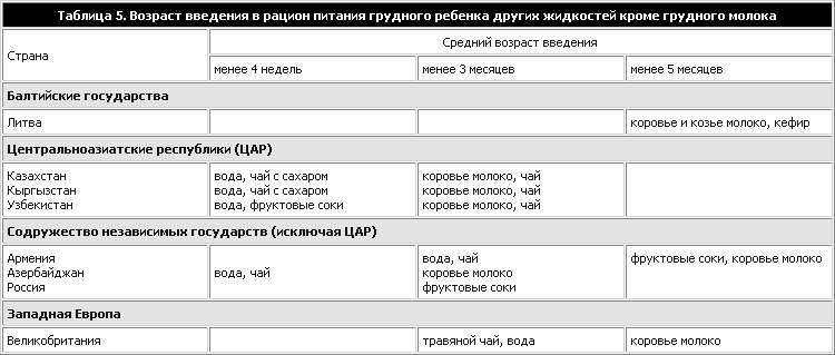 По всей территории Европейского региона распространено искусственное вскармливание детей. В Узбекистане из бутылочки с соской вскармливалось 35% детей в возрасте до 3 месяцев, которые были охвачены “Обследованием демографических характеристик и состояния здоровья” 1996 г., причем 12% получали детскую питательную смесь, а 23% – сгущенное молоко (9). Использование коровьего молока больше распространено в сельских районах. Раннее введение коровьего молока связано с кровопотерей в желудочно-кишечном тракте. Поскольку в коровьем молоке также низки содержание и биологическая доступность железа, раннее введение коровьего молока может привести к недостаточности железа (см. главу 6). В Российской Федерации у 12-месячных детей, которые получали коровье молоко в течение первых трех месяцев жизни, отмечались уровни гемоглобина значительно ниже, чем у детей, получавших коровье молоко начиная с 7-месячного возраста (О. Нетребенко, из личной переписки, 1997 г.). Аналогичным образом, в Соединенном Королевстве больше вероятности получения коровьего молока у детей выходцев из Азии, чем у белых детей, и поэтому у азиатских детей больше вероятности развития железодефицитной анемии (29). Кроме того, азиатские дети обычно потребляют коровьего молока больше, чем белые дети (30). Проведенное в Италии исследование показало, что в период с 1983 по 1992 гг. снижение процента грудных детей, которым давали коровье молоко, при одновременном росте процента грудного вскармливания сопровождалось снижением распространенности как анемии, так и недостаточности железа среди грудных детей и детей раннего возраста (31). В таблице 5 показано раннее введение коровьего молока и других жидкостей в рацион питания грудных детей в некоторых странах. В Литве коровье молоко разбавляют водой или смешивают с отваром круп – риса, овса или гречневой крупы. В Азербайджане используют пшеничную муку в сочетании с разбавленным коровьим молоком и яйцом. В Российской Федерации типы других жидкостей кроме грудного молока, которые даются детям, различаются в крупных городах и в поселках и сельской местности. В Москве около 50% грудных детей в возрасте 2 месяцев начинают получать детскую питательную смесь в дополнение к грудному молоку. Кроме детских питательных смесей около 10% грудных детей в городах получали неадаптированное молоко (коровье молоко, кефир, козье молоко) в качестве добавок в течение первых четырех месяцев. 22% детей в поселках и в сельской местности получали коровье молоко или кефир не реже трех раз в день в течение первых 4 месяцев вместо грудного молока. Сроки введения неадаптированного молока зависят от уровня образования матери и от доходов семьи: в малообеспеченных семьях дети получают коровье молоко значительно раньше, чем дети в более обеспеченных семьях (О. Нетребенко, из личной переписки, 1997 г.). К числу других жидкостей, которые обычно даются детям в первый или второй месяц жизни, относятся обычная или подслащенная вода и чай. В Узбекистане 40% детей получали чай в первый месяц после рождения, а к возрасту 3 месяцев этот процент повышался до 72% (21). Такая же картина характерна и для других Центральноазиатских республик. Например, в Казахстане, Кыргызстане и Узбекистане 21%, 34% и 49% грудных детей соответственно получали чай в первые несколько месяцев жизни (19). В Армении вода 