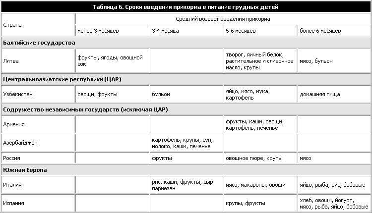 В таблице 6 показаны сроки введения в некоторых странах пищи для прикорма. В Российской Федерации доля грудных детей, получающих пищу для прикорма до 4-месячного возраста, колеблется от 17% в Санкт-Петербурге до 32% на Урале (О. Нетребенко, из личной переписки, 1997 г.). Точно так же в Армении детям в возрасте 4–5 месяцев дают полутвердую пищу (фруктовые и овощные пюре, каши и картофель) и печенье, а в 6 месяцев им дают яйцо. Примерно в 8–9 месяцев начинают давать хлеб и макароны, мясной фарш, фрукты и овощи. В последнюю очередь – примерно в 1 год – вводятся другие мясные блюда и рыба. По сравнению с Российской Федерацией, в Армении можно видеть меньше различий в сроках введения различных продуктов между городскими и сельскими районами или между коренными жителями и беженцами (6). В Соединенном Королевстве в 1996 г. белые матери обычно начинали давать своим детям твердую пищу раньше, чем азиатские матери. В возрасте 8 недель ту или иную твердую пищу получали 2% детей выходцев из Бангладеш, 3% из Пакистана и 5% из Индии, а среди белых детей – 18%. Во всех группах большинство матерей вводили пищу в период от 8 недель до 3 месяцев. К достижению возраста 3 месяцев от 70% до 73% азиатских матерей и 83% белых матерей давали своим детям ту или иную твердую пищу (29). В Центральноазиатских республиках рационы питания грудных детей часто однообразны и состоят, главным образом, из каши, бедной пищевыми веществами. Результаты “Обследования демографических характеристик и состояния здоровья” 1996 г. в Узбекистане (9) показывают, что за 24 часа, предшествовавшие интервью, 19% детей в возрасте от 4 до 7 месяцев получали мясо, птицу, рыбу или яйцо, а 35% получали фрукты или овощи. В Балканском регионе дети в Албании получают питание, основанное, главным образом, на крупах (35), а в Бывшей Югославской Республике Македония рационы питания включают большое количество зерновых, бобов и овощей. Влияние социально-экономической ситуации на пищевой статус проявляется в том, что снижается способность покупать мясные и молочные продукты из-за высоких цен (36). Таким образом, введение фруктов и овощей, а также мяса и печени может быть задержано или уменьшено в количественном отношении экономическими и/или сезонными факторами. Напротив, в Италии мясо вводится в 5–6 месяцев, а в Испании после 6 месяцев. 1.3. литература1. PELLETIER, D.L. The relationship between child anthropometry and mortality in developing countries: implications for policy, programs and future research. Journal of nutrition, 124: 2047S–2081S (1994). 2. Measuring change in nutritional status. Geneva, World Health Organization, 1983. 3. Prevention and control of iron deficiency anaemia in women and children. Report of the UNICEF/WHO Regional Consultation, Geneva, 3–5 February 1999. Geneva, United Nations Children’s Fund, 1999. 4. Central and eastern Europe in transition: public policy and social conditions. Poverty, children and policy: responses for a brighter future. Florence, UNICEF International Child Development Centre, 1995 (Economies in Transition Studies, Regional Monitoring Report, No. 3). 5. Health and health care. Yerevan, Ministry of Health of Armenia, 1997. 6. BRANCA, F. ET AL. The health and nutritional status of children and women in Armenia. Rome, National Institute of Nutrition, 1998. 7. BRANCA, F. ET AL. Mulitiple indicator cluster survey in Fyrom with micronutrient component. Rome, National Institute of Nutrition, 1999. 8. Kazakstan Demographic and Health Survey, 1995. Calverton, MD, Macro International Inc., 1996. 9. Uzbekistan Demographic and Health Survey, 1996. Calverton, MD, Macro International Inc., 1997. 10. ROBERTSON, A. ET AL. Nutrition and immunisation survey of Bosnian women and children during 1993. International journal of epidemiology, 24: 1163–1170 (1993). 11. WHO global database on child growth and malnutrition. Geneva, World Health Organization, 1997 (document WHO/NUT/97.4). 12. Nutrition survey of children under 5 of Azerbaijan. Geneva, World Health Organization and United Nations Children’s Fund, 1997. 13. REILLY, J.J. ET AL. Prevalence of overweight and obesity in British children: a cohort study.