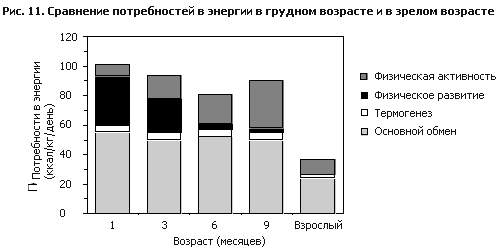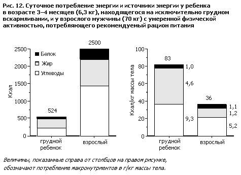 Энергия требуется для поддержания жизнедеятельности и роста тканей, для выделения тепла (термогенеза) и для физической деятельности. Чувствительным индикатором достаточности потребления энергии у детей раннего возраста является прирост массы тела. Потребность в энергии – это количество пищевой энергии, необходимое для приведения в равновесие расходуемой энергии и энергии, накапливаемой в новых тканях (физическое развитие). Расход энергии можно подразделить на основной обмен, на долю которого приходится 50–60% общего расхода энергии (ОРЭ) у большинства здоровых детей, энергию, расходуемую на физическую активность (30–40% ОРЭ) и термогенез (примерно 5–8% ОРЭ). Количество энергии, требующееся для физического развития, быстро уменьшается с примерно 35% ОРЭ при рождении до 5% в возрасте 1 год (рис.11). Можно считать, что основной обмен представляет собой потребность в “обеспечении жизнедеятельности”, так как это расход энергии на биосинтез, обмен веществ и физическую работу дыхательной и сердечной функций. Количество энергии, расходуемой на физическую активность, колеблется в широких пределах, а энергия, расходуемая на термогенез, – это главным образом затраты на переваривание, всасывание и повторный синтез пищевых веществ. Физическое развитие требует расхода некоторого количества энергии на биосинтез, помимо затраты энергии на вновь синтезируемые ткани. источники Пищевая энергия потребляется в виде жира, углеводов и белков. На долю жира приходится примерно 50% энергии в грудном молоке, и он является основным источником энергии для грудных детей младше 6 месяцев. С введением прикорма жир как главный источник энергии постепенно вытесняется углеводами, и вместе они удовлетворяют потребности растущего ребенка в энергии. Пищевые белки тоже могут окисляться и выделять энергию, но ее главная роль состоит в обеспечении физического развития и жизнедеятельности тканей. В пересчете на единицу массы тела величины потребления энергии, жира и углеводов у нормального грудного ребенка в первые месяцы жизни намного больше, чем соответствующие величины потребления у взрослых (рис. 12). Это объясняется тем, что максимальные темпы физического развития приходятся на грудной возраст, когда ребенок в первые 6 месяцев удваивает массу тела, а к 1 году утраивает ее. В пересчете на единицу массы тела потребление энергии ребенком, находящимся на исключительно грудном вскармливании, в 2,3 раза больше, чем потребление энергии взрослым. По сравнению со взрослым и в пересчете на грамм питательного макроэлемента потребление белка в граммах у грудного ребенка почти такое же, как у взрослого, потребление жира почти в четыре раза больше, а потребление углеводов – в два раза больше. потребности