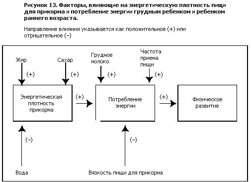 У грудных детей и детей раннего возраста потребление энергии на килограмм массы тела в 2–3 раза больше, чем у взрослых (рис. 11 и 12). Поскольку им приходится поглощать большие количества энергии, ключевым определяющим фактором потребления энергии является энергетическая плотность пищи для прикорма. Слишком низкая энергетическая плотность может привести к дефициту энергии и, следовательно, к замедленному физическому развитию. Количество энергии, которое ребенок может потребить с пищей, определяется целым рядом факторов (рис. 13). Энергетическую плотность можно повысить, увеличив содержание жира и сахара, а вот увеличение содержания воды снижает энергетическую плотность. Потребление энергии увеличивается за счет пищи для прикорма с большей энергетической плотностью, более частого приема пищи и увеличения потребления грудного молока. И наоборот, потребление энергии снижается, если пища для прикорма очень вязкая, тягучая, что обычно является результатом высокого содержания крахмала. На потребление энергии влияет также функциональная вместимость желудка, которая определяет тот объем пищи, который ребенок может поглотить за один прием. Функциональная вместимость желудка определяется не только объемом желудка, но и скоростью его опорожнения. Если энергетическая плотность съеденной пищи низка, ребенку для удовлетворения его потребностей в энергии потребуется большой объем пищи, который может превышать функциональную вместимость его желудка. Функциональная вместимость желудка составляет, по оценкам, около 30 г/кг массы тела (5). Это равняется количествам примерно 250, 285 и 345 г за один прием пищи для грудных детей со средней массой тела в возрасте соответственно 6–8, 9–11 и 12–23 месяцев. Эти оценки вместимости желудка были использованы при расчете минимальной энергетической плотности прикорма (5). В таблице 12 показаны величины энергетической плотности, которые требуются для удовлетворения потребностей в энергии при условии среднего потребления грудного молока (таблица 11) или при отсутствии потребления грудного молока и при разной частоте приема пищи. Эти цифры зависят от целого ряда исходных допущений о вместимости желудка, о количестве приемов пищи и составе каждого приема пищи, поэтому их нужно рассматривать как приблизительные оценки. Между разными продуктами для прикорма отмечаются значительные различия в энергетической плотности. К продуктам с высокой плотностью относятся мясо и жирная рыба. Однако большинство пищи, используемой для прикорма, основывается на каком-либо главном продукте, богатом сложными углеводами и потому объемном и вязком и часто имеющем низкую энергетическую и пищевую плотность. Например, очень низкую энергетическую плотность (менее 2,1 кДж/г, или менее 0,5 ккал/г) обычно имеют каши, если готовить их без молока или жира. Для уменьшения вязкости и облегчения тем самым потребления для грудных детей и детей раннего возраста в пищу для прикорма, в особенности в каши, часто добавляют воду. Это еще больше снижает их энергетическую и пищевую плотность, и поэтому делать этого не рекомендуется. Существует несколько способов увеличения энергетической плотности пищи для прикорма. Добавление жира или сахара повышает энергетическую плотность, не вызывая увеличения вязкости пищи (рис. 13). Наибольший эффект д