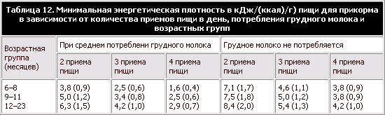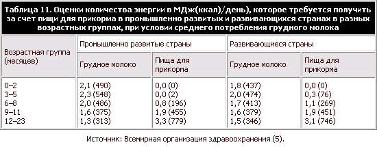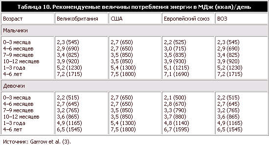 В таблице 10 дается обзор оценочных величин потребностей в энергии, рекомендуемых Соединенным Королевством, Соединен– ными Штатами, Европейским союзом и ВОЗ для грудных детей и детей разных возрастных групп. Эти величины выведены из оценки потребностей в энергии на килограмм массы тела, помноженных на среднюю массу тела для данной возрастной категории. Между ними отмечается значительное сходство, и поэтому подобные международные сравнения могли бы послужить основой для рекомендаций в странах, которые хотят выработать собственные нормативы или физиологические нормы для энергии. Для девочек и мальчиков младше 2 лет эталонные величины потребления пищевых веществ в пересчете на единицу массы тела считаются одинаковыми. Поэтому благодаря большей средней массе тела, мальчики имеют более высокие оценочные величины средней потребности в энергии. физическая активность Потребности в энергии меняются в зависимости от физической активности и наличия стрессовых условий окружающей среды – таких, как экстремальные значения температуры, а также во время болезни, однако точных оценок диапазона этих изменений для грудных детей и детей раннего возраста не имеется. Ключевую роль в психологическом и социальном развитии детей раннего возраста играет физическая активность, поэтому чрезвычайно важно, чтобы дети получали достаточное количество энергии для поддержания оптимального уровня физической активности. Имеются некоторые данные, говорящие о том, что, когда потребляемой энергии недостаточно, уровень активности может снижаться, чтобы обеспечить продолжение физического развития (4). энергия, требующаяся за счет пищи для прикорма Величина энергии, которая требуется за счет пищи для прикорма, зависит от величины энергии, которую организм получает с грудным молоком, и от потребностей в энергии каждого отдельного ребенка. Поэтому оценить среднее количество энергии, которое требуется за счет одной пищи для прикорма, трудно. Тем не менее, попытка оценить это количество была сделана в отчете ВОЗ/ЮНИСЕФ о введении прикорма в развивающихся странах (5). Энергию, которую требуется получить за счет пищи для прикорма, можно рассчитать, вычтя количество энергии, потребленное с грудным молоком, из рекомендуемой величины потребления энергии. Для рекомендуемой величины потребления энергии используются величины, предложенные Butte (2) (таблица 9) для грудных детей до 12 месяцев и Torun et al. (6) для детей от 12 месяцев и старше. Оценки среднего потребления грудного молока были выведены из всеобъемлющего обзора опубликованной литературы как по развивающимся, так и по промышленно развитым странам, а также по детям, находящимся как на исключительно, так и на частично грудном вскармливании. При этом было принято допущение о том, что для всех этих групп грудных детей потребности в энергии одинаковы. Поскольку в развивающихся странах среднее потребление грудного молока было несколько ниже, чем в промышленно развитых странах, количество энергии, которое требовалось получить за счет пищи для прикорма в возрастной группе 3–8 месяцев в развивающихся странах несколько больше (таблица 11). Первоначальные теоретические анализы (5) включают диапазон величин потребления грудного молока от высокой до низкой (средняя величина +2 стандартных отклонения). Диапазон это