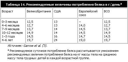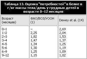 Рекомендации 1985 г. в отношении потребностей в белке детей до 6 месяцев (1) были основаны на данных о потреблении по детям, находящимся на грудном вскармливании. Был сделан вывод о том, что потребности в белке детей до 6 месяцев будут полностью удовлетворяться, если удовлетворяются потребности в энергии и получаемая ими пища содержит белки, которые по количеству и качеству эквивалентны белкам, содержащимся в грудном молоке. Не все белки в грудном молоке являются “питательными”, так как некоторые функциональные белки – такие, как секреторный IgA – встречаются в стуле. Тем не менее, хотя потребности в белке на единицу массы тела у грудных детей больше, чем у любой другой возрастной группы, азот в грудном молоке характеризуется высокой биологической доступностью и хорошо усваивается, и этому соответствует высокое потребление энергии на единицу массы тела. Эта концепция может быть проиллюстрирована на примере потребностей в энергии и белке трехмесячного ребенка. Грудное молоко идеально адаптировано к потребностям грудного ребенка и содержит относительно мало белков по сравнению с коровьим молоком. В возрасте 3 месяцев на долю потребляемых белков приходится приблизительно 5–6% общего потребления энергии, по сравнению примерно с 10–15% у взрослых. Однако при среднем потреблении грудного молока около 800 мл в день потребности в белке (которые оцениваются в 1,4 г/кг массы тела) будут удовлетворены. Таблица 13 показывает, что оценка потребностей в белке у грудных детей в возрасте 2–5 месяцев, сделанная в 1985 году (1), была на 7–19% выше, чем количества, потребляемые детьми на исключительно грудном вскармливании, оценка которых была сделана в исследовании Dewey et al. (14). Наиболее вероятным объяснением этой разницы является то, что в 1985 г. потребности в белке были завышены. В оценке средней потребности в белке 1985 г. был использован модифицированный факторный подход, основанный на оценке потребностей в азоте для обеспечения жизнедеятельности и для физического развития, которые у детей до 2 лет составляют значительный процент. Достоверность этих оценок ограничивается недостатком данных и зависимостью от некоторых исходных допущений, и поэтому нужны дополнительные подтверждения, на которых можно было бы основывать достоверные оценки безопасного уровня потребления белков детьми, особенно в критический период ускоренного физического развития в первые 12 месяцев. За отсутствием подтверждения прямым экспериментированием, потребности в белке основываются на оценке такого количества потребляемых белков, которое удовлетворяло бы средние потребности; после этого устанавливается безопасный уровень на два стандартных отклонения выше этого количества, чтобы обеспечить удовлетворение потребностей огромного большинства грудных детей. Оценки безопасных потребностей в белке у детей от 0 до 12 месяцев показаны в таблице 13. На этих оценках потребностей основаны национальные и международные рекомендации (таблица 14). Старые советские “физиологические нормы” для белка были значительно выше (в некоторых случаях более чем в три раза), чем уровни, рекомендуемые международными комитетами экспертов. В результате этого при исследованиях по изучению достаточности потребления белков в бывших советских республиках может быть сделан ошибочный вывод о том, ч
