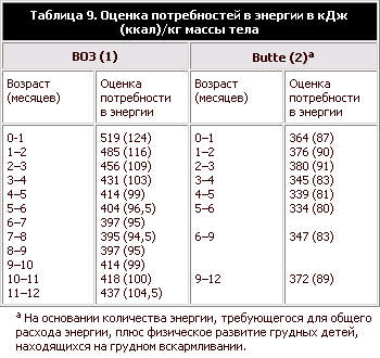 Нынешние рекомендации ВОЗ в отношении потребления энергии в течение первых 12 месяцев жизни (1) были основаны на средних величинах потребления энергии, наблюдаемых у здоровых детей в богатых странах, с добавлением 5% на предполагаемое занижение величины потребления грудного молока. Butte (2) сделал обзор литературы по данному вопросу, опубликованной с 1985 г., и предложил обновленные оценки потребностей в энергии детей как находящихся на исключительно грудном вскармливании, так и вскармливаемых детскими питательными смесями. В основу этих оценок были положены величина потребления энергии, ОРЭ, измеренный методом с дважды меченной водой, и количество энергии, требуемое для физического развития (отложения ткани). Эти обновленные величины потребностей в энергии значительно ниже прежних рекомендаций (1) (таблица 9), и это позволяет предположить, что в нынешних рекомендациях потребности грудного ребенка в энергии, возможно, завышены на 15–30%. Обе совокупности цифр в таблице 9 показывают, что между 3 и 6 месяцами потребление энергии на килограмм массы тела падает и остается на низком уровне до 9 месяцев, а затем к возрасту 1 года снова повышается. Такое снижение отражает период, когда характерное для первых 3 месяцев очень быстрое физическое развитие замедлилось, но еще не уравновешено увеличением физической активности.