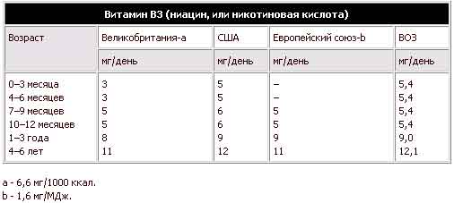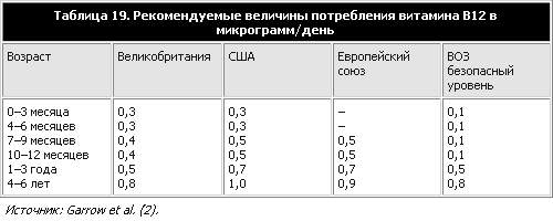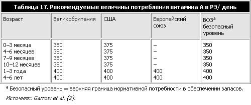 Для того, чтобы выразить потребности в витамине А в единицах, позволяющих учесть различия в активности ретинола и каротиноидов, вместо единицы “ретиноловый эквивалент” (РЭ) стали использовать Международные единицы (МЕ). 1 микрограмм ретинола эквивалентен 1 РЭ, а бета-каротина для образования 1 РЭ требуется 6 микрограмм (1 РЭ = 3,33 МЕ витамина А). Грудные дети рождаются с запасами витамина А в печени, и эти запасы вместе с витамином А, потребляемым с грудным молоком, удовлетворяют их потребности примерно до 6 месяцев. Количество витамина А, которое поступает в грудное молоко, зависит от потребления и запасов витамина у матери. Если статус витамина А у матери достаточен, грудное молоко остается важным источником витамина А и после 6 месяцев. Матери же, испытывающие недостаточность витамина А, могут не обеспечивать достаточного его количества в своем грудном молоке для пополнения запасов в печени ребенка или для защиты ребенка от недостаточности в возрасте старше 6 месяцев (1). Для детей, входящих в группы населения с высокой распространенностью недостаточности витамина А, важным источником витамина А в возрасте старше 6 месяцев является пища для прикорма. Международные рекомендации в отношении потребления витамина А (таблица 17) отличаются удивительной последовательностью; в них говорится, что величины потребления порядка 350–400 РЭ в день должны удовлетворять потребности всех здоровых грудных детей и детей раннего возраста. Низкий уровень потребления Грудные дети и дети раннего возраста не защищены от отрицательного воздействия как недостаточности, так и избытка витамина А. Во многих странах развивающегося мира главной поддающейся предупреждению причиной детской слепоты является ксерофтальмия – результат тяжелой и длительной недостаточности витамина А. В Европейском регионе ВОЗ открытая клиническая недостаточность витамина А проблемой не является, хотя данные о распространенности недостаточности витамина А в Регионе ограничены. В Узбекистане у 40–60%, а в Армении примерно у 1% детей до 5 лет содержание ретинола в сыворотке было ниже 0,35 микромоль/литр (100 микрограмм/литр), что указывает на тяжелую степень недостаточности (3,4). В бывшей Югославской Республике Македония легкая степень недостаточности витамина А (содержание ретинола в сыворотке ниже 0,70 микромоль/литр, или 200 микрог/литр) была у 30% детей до 5 лет (5). Имеющиеся данные свидетельствуют о том, что легкая степень недостаточности витамина А без клинических признаков ассоциируется с повышенной восприимчивостью к инфекции, а исследования с вмешательством позволяют предположить, что введение дополнительного количества витамина А категориям населения, испытывающим его недостаточность, может снизить смертность (6) и заболеваемость от инфекционных болезней (7). Кроме того, недостаточность витамина А является фактором, способствующим развитию анемии. Упомянутое выше исследование, проведенное в Узбекистане (3), показало, что 40% анемичных детей в возрасте до 5 лет страдали недостаточностью железа и витамина А, а 20% – только дефицитом витамина А. Между витамином А и железом существует определенное взаимодействие. В категориях с дефицитом обоих этих пищевых веществ введение добавок железа оказывает положительное действие на статус витамина А и наоборот (8). Результаты недавни