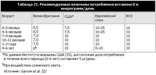 Поскольку витамин D главным образом образуется при воздействии на кожу солнечного света, установить рекомендации в отношении потребления его с пищей (см. таблицу 21) трудно. Положение с витамином D у новорожденных во многом определяется состоянием здоровья матери. При недостаточности витамина D у матери во время беременности у новорожденного тоже будет низкая концентрация в плазме и низкий уровень запасов витамина D. На содержание витамина D в грудном молоке также влияет наличие витамина D у матери, и из-за сильной зависимости между содержанием витамина D в организме матери и у грудного ребенка в некоторых странах беременным женщинам рекомендуется давать добавки витамина D. Особенно незащищены от дефицита витамина D дети в возрасте до 3 лет, так как у них высоки потребности физического развития и велика скорость отложения кальция в костях. Однако количество солнечного света, воздействие которого необходимо для удовлетворения потребностей в витамине D грудных детей, невелико. Воздействие солнечного света только на лицо (или на нижние участки рук и ног) в течение 30 минут каждый день дает, согласно подсчетам, около 10 микрограмм (400 МЕ) витамина D в день – количества, аналогичного РВПВ для детей раннего возраста. Поскольку витамин D является жирорастворимым веществом, в организме могут быть накоплены достаточные запасы для обеспечения физиологических потребностей в те дни или даже месяцы, когда нет солнечного света. Способность синтезировать витамин D из солнечного света изменяется в зависимости от местонахождения и времени года. Люди, живущие в южных широтах Региона, могут синтезировать достаточное количество витамина D под минимальным воздействием солнца с апреля по октябрь, при крайне низком или нулевом синтезе в течение оставшейся части года. Во время северной зимы солнца может быть мало или не быть вовсе в течение 6 или более месяцев, поэтому для грудных детей и детей раннего возраста на севере в этот период может потребоваться введение добавок витамина D. Грудных детей не следует выставлять под прямые лучи солнца на длительное время, поскольку есть опасность получить солнечные ожоги, особенно в летний полдень. В странах с очень жарким климатом и длинным световым днем для предотвращения солнечных ожогов следует применять солнцезащитные кремы. Однако солнцезащитные кремы могут уменьшить или даже полностью остановить синтез витамина D, поэтому рекомендуется оставлять ребенка на солнце без защиты примерно на 15 минут рано утром или ближе к вечеру, когда солнце не такое обжигающее. Ввиду большого диапазона географических широт, программные мероприятия на территории Европейского региона ВОЗ, необходимые для профилактики недостаточности витамина D, будут заметно отличаться друг от друга. В некоторых европейских странах рекомендуется, чтобы грудные дети получали ежедневную добавку витамина D. Например, в Соединенном Королевстве рекомендуется давать детям в 6 месяцев и старше, находящимся на грудном вскармливании, а также беременным женщинам и кормящим матерям добавки витамина в количестве 7микрограмм/день. В большинстве стран, в которых существуют рекомендации о введении добавок витамина D, обычно рекомендуются дозы от 7 до 10 микрограмм/день (280–400 МЕ в день). Однако все еще существуют сомнения в отношении того, сколько н