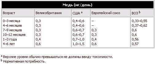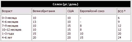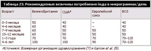 Йод легко всасывается в организм, а избыточное потребление хорошо регулируется почечной экскрецией. В присутствии струмогенных факторов (которые содержатся, например, в капусте, репе, брюкве, брюссельской капусте и брокколи) утилизация поглощенного йода снижается, и поэтому потребление йода нужно увеличивать. РВП для йода (таблица 23) основаны на потребностях для предупреждения зоба (около 1–2 микрограмм/кг массы тела) плюс 100% коэффициент безопасности. В европейских странах с легкой степенью йодной недостаточности была дана рекомендация расширить РВП 90 µг/ день на возраст от 0 до 12 месяцев, поскольку именно такая величина потребления требуется для достижения положительного йодного баланса у растущего ребенка (9). В группах населения, где нет подтверждения широкого распространения йододефицитных расстройств, потребности грудных детей в йоде в течение первых нескольких месяцев жизни будут удовлетворяться исключительным грудным вскармливанием. Низкий уровень потребления