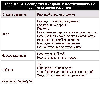 Йодная недостаточность является самой распространенной в мире отдельно взятой причиной поддающихся предупреждению церебральных нарушений и задержки умственного развития (3). Термин “йододефицитные расстройства” относится к широкому спектру последствий йодной недостаточности для физического и умственного развития. Недостаточность приводит к уменьшению синтеза гормона щитовидной железы. Пытаясь захватить больше йода, щитовидная железа расширяется, что ведет к развитию зоба, который является наиболее явным и знакомым признаком йодной недостаточности. На всех стадиях развития, однако, видны и другие эффекты, которые особенно значимы в период развития плода и в неонатальный период (таблица 24). В группах населения с широкой распространенностью йододефицитных расстройств достаточно тяжелой степени, чтобы вызывать гипотироксинемию во время беременности, снижается физиологическая передача гормонов щитовидной железы от матери к плоду. Следствием этого является необратимое повреждение головного мозга, проявляющееся в неврологических признаках эндемического кретинизма. Кроме того, йодная недостаточность, возникающая в поздний период беременности и сохраняющаяся в период лактации, ведет к низкому содержанию йода в грудном молоке и к возможному приобретенному в перинатальный период гипотиреозу у ребенка, находящегося на грудном вскармливании. Этим объясняется гипотиреозная составляющая эндемического кретинизма (11). В районах эндемических йододефицитных расстройств для предупреждения как церебральных нарушений, так и гипотиреоза у детей, находящихся на грудном вскармливании, требуется вводить добавки йода начиная с раннего периода беременности, а еще лучше до зачатия, и продолжать их в течение всего периода лактации (11). В районах эндемической йодной недостаточности отмечаются пониженные концентрации йода в грудном молоке (12). Недостаточность йода повышает чувствительность детей к канцерогенному эффекту облучения щитовидной железы. По мнению исследователей, воздействие радиоактивных осадков в районах, прилегающих к Чернобылю, сыграло важную роль в развитии гипотиреоза и рака щитовидной железы у населения пораженных районов (13). Коррекция йододефицитных расстройств Поскольку недостаточность йода является главным образом следствием геологических, а не социально-экономических условий, ее невозможно устранить путем изменения привычек питания. Проблема йодной недостаточности решается двумя стратегическими путями: введением добавок йода и обогащением пищевых продуктов. Общепринятая стратегия профилактики заключается в сплошном йодировании соли, предусматривающем йодирование соли, употребляемой дома, а также соли, используемой в сельском хозяйстве, пищевой промышленности и в общественном питании (14). Выбор такого подхода основывается на следующих фактах: Соль является одним из немногих продуктов, которые ближе всех подходят к определению “продукт всеобщего потребления”. Потребление соли почти не изменяется в течение года в данном регионе. Производство соли обычно ограничено несколькими центрами. Технология йодирования соли доступна по вполне приемлемым ценам (0,4–1,5 центов США за килограмм и 2–8 центов США на одного человека в год). Добавление йода в соль не влияет на ее цвет, вкус и запах. Колич