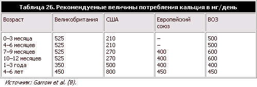 Грудное молоко содержит большое количество кальция и может полностью удовлетворять потребности грудного ребенка примерно до 6 месяцев. После этого грудное молоко должно оставаться источником большей части кальция, требующегося грудным детям и детям раннего возраста. Рекомендуемые величины потребления кальция показаны в таблице 26. Низкий уровень потребления В изолированном виде недостаточность кальция в детстве бывает редко. На практике она случается только у детей раннего возраста, не получающих молока или молочных продуктов. Нарушения обмена кальция, ассоциируемые с рахитом и стеатореей, обычно связаны с недостаточностью витамина D, а не кальция, хотя и описывались случаи рахита, являющегося следствием дефицита кальция (24). Потребление кальция грудными детьми, которых кормят макробиотическими рационами, может быть меньше половины количества, потребляемого детьми, которые получают невегетарианское или молочно-вегетарианское питание, а высокие концентрации фитатов или оксалатов могут еще больше уменьшить всасывание кальция из макробиотического рациона. Крайне низкий уровень потребления кальция у детей может привести к развитию рахита, задержке роста и появлению биохимических признаков гиперпаратиреоза (24). Всасыванию кальция может мешать связывание с жирными кислотами с длинной цепью, присутствующими в детских питательных смесях и немодифицированном коровьем молоке. Гипокальциемия может вызывать припадки и тетанию (мышечно– скелетные спазмы и судороги, особенно в пальцах и на лице) и ощущения покалывания и онемения. Кормление детей, не находящихся на грудном вскармливании, модифицированной детской питательной смесью с низким содержанием фосфора практически устраняет данную проблему. Если грудных детей и детей раннего возраста кормят рационом, не включающим ни грудного молока, ни коровьего молока, ни молочных продуктов (после 9 месяцев), достичь рекомендуемой величины потребления кальция почти невозможно. В результате распространена рекомендация о том, что такие дети должны получать ежедневную добавку кальция. Однако долговременные последствия поступления кальция ниже РВП для этой возрастной группы неизвестны. Высокий уровень потребления Данных о том, что чрезмерно высокое потребление кальция причиняет вред, мало, если не считать крайней ситуации молочно-щелочного синдрома, который в детстве случается редко (21). Поглощение больших количеств щелочных солей кальция может превысить способность почек выводить нежелательный кальций и тем самым вызвать гиперкальциемию и метастатическую кальцификацию роговицы, почек и кровеносных сосудов. Гиперкальциемия (повышенное содержание кальция в крови) вызывает жажду, легкую спутанность сознания и раздражительность, потерю аппетита, утомление и слабость. 5.4. натрийФункции Большая часть натрия находится во внеклеточной жидкости. Он играет важную роль в регулировании внеклеточного объема и кислотно-щелочного баланса, электрической активности клеток, проведения возбуждения по нерву и мышечной функции. Источники Содержание натрия в натуральных продуктах питания относительно невелико: небольшие количества его содержатся в мясе, рыбе, яйце и молоке. Большая часть находящегося в пище натрия поступает в виде соли. Некоторое количество соли добавляется при 