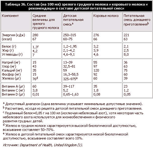 Достоверно доказано, что человеческое грудное молоко превосходит все заменители, в том числе детские питательные смеси промышленного производства. Состав человеческого грудного молока не постоянен, а изменяется во время кормлений, в зависимости от времени суток, а также в процессе лактации. Общий объем выработки материнского молока и потребления его ребенком чрезвычайно изменчив, и хотя, говоря о среднем потреблении молока грудными детьми, часто называют цифры 650–850 мл в день, величины могут колебаться от очень малых количеств до более одного литра в день, что почти целиком зависит от частоты и эффективности сосания. Потребление грудного молока ребенком в период исключительно грудного вскармливания увеличивается, достигая постоянного уровня 700–800 мл в день примерно через 1–2 месяца, а после этого возрастает лишь незначительно. Состав грудного молока в сравнении с составом детской питательной смеси промышленного производства, коровьего молока и питательной смеси домашнего приготовления показан в таблице 36. Жир Энергетическая плотность грудного молока составляет приблизительно 280 кДж (67 ккал)/100 мл. На долю жира приходится около 50% общей калорийности грудного молока. Раннее молоко, появляющееся в начале кормления, более водянистое, содержит больше лактозы и имеет относительно низкую концентрацию жира, которая затем повышается так, что молоко с наивысшей энергетической плотностью выделяется в конце кормления. Это позднее молоко, таким образом, вносит важнейший вклад в потребление энергии ребенком. Богатое жиром молоко течет медленнее, но обеспечивает ребенка столь важными энергией и пищевыми веществами, поэтому не нужно прекращать кормление, когда поток молока замедлился или ребенок начинает сосать менее энергично. Коровье молоко и грудное молоко значительно отличаются друг от друга по процентному содержанию жирных кислот (таблица 36). По сравнению с коровьим молоком, в грудном молоке выше процент ненасыщенных жирных кислот и выше концентрация незаменимых жирных кислот. Кроме того, содержащиеся в грудном молоке полиненасыщенные жирные кислоты с длинной цепью (ПНЖКДЦ) всасываются лучше, чем ПНЖКДЦ из коровьего молока. Имеющиеся данные также свидетельствуют о том, что ПНЖКДЦ важны для нормального развития нервной ткани и зрительной функции коры головного мозга. Поскольку в первые несколько месяцев жизни способности новорожденного превращать жирные кислоты в ПНЖКДЦ ограничены, потребности организма ребенка обеспечиваются за счет эффективной передачи ПНЖКДЦ от матери: в дородовой период через плаценту, а в послеродовой – с грудным молоком. Содержащиеся в молоке жиры также являются носителями для поглощения жирорастворимых витаминов А, D, Е и К (см. ниже). Углеводы Основным видом углеводов в грудном молоке является лактоза, на долю которой приходится около 40% его калорийности и которая хорошо переваривается и всасывается (> 90%) в тонкой кишке под влиянием лактазы из эпителия. Неусвоенная лактоза переходит в толстую кишку, где в результате ферментации под действием присутствующих там бактерий превращается в жирные кислоты с короткой цепью и лактат, которые, в свою очередь, всасываются и вносят свой вклад в потребление энергии, а также уменьшают показатель рН в толстой кишке, улучшая всасывание кальция. Кроме эт