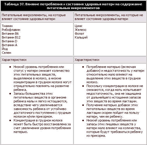 Хотя женщины с предельно низким пищевым статусом и могут вырабатывать молоко в достаточном количестве и достаточного качества для нормального развития грудного ребенка, оптимальный состав грудного молока по питательным микроэлементам, а следовательно и оптимальное содержание таких питательных микроэлементов грудного ребенка зависит от того, в какой степени поддерживается нормальный пищевой статус матери. Для того, чтобы можно было прогнозировать риск недостаточности питательных микроэлементов у грудного ребенка или у матери и потенциальное влияние получения матерью добавок на состав грудного молока, а также планиро– вать соответствующие меры вмешательства, представляется полезным разделить содержащиеся в грудном молоке питательные микроэлементы на две группы (таблица 37). Питательные вещества, содержащиеся в грудном молоке, на которые больше всего влияют величины их потребления с пищей матерью, – это прежде всего водорастворимые витамины и, в меньшей степени, жирорастворимые витамины. На количество же минералов, выделяемых в грудное молоко, напротив, не влияют, за малым исключением, ни их потребление матерью с пищей, ни запасы в материнском организме. В тех случаях, когда потребление матерью может повлиять на выделение питательных веществ в молоко, обычно есть некоторый уровень стабилизации, выше которого дальнейшее увеличение потребления не оказывает никакого действия на повышение их концентраций в молоке. У детей, находящихся на исключительно грудном вскармливании, недостаточность питательных микроэлементов с клиническими признаками в первые 6 месяцев жизни встречается редко. Если положение с питательными микроэлементами у матери во время беременности и лактации удовлетворительно, детям до 6 месяцев, находящимся на исключительно грудном вскармливании, добавки витаминов или минералов не требуются. Когда же имеет место дефицит питательных микроэлементов, то улучшение питания матери или получение ею добавок будет, скорее всего, давать положительные результаты и принесет пользу как самой матери, так и ребенку. Витамин АВитамин А имеет жизненно важное значение для роста и развития и дифференциации тканей, особенно эпителия желудочно-кишечного и дыхательного трактов. Грудное молоко, в особенности молозиво, является хорошим источником витамина А. У грудных детей на грудном вскармливании редко бывают признаки недостаточности даже при малых дозах потребления, однако в случае дефицита витамина А у матери у них может проявляться субклиническая недостаточность. Витамин DВитамин D вырабатывается, главным образом, посредством фотосинтеза в коже под действием ультрафиолетовых лучей. Витамин D у новорожденного зависит от степени наличия витамина D в организме матери во время беременности и лактации. При нехватке его запасы в организме ребенка будут низкими, и содержания витамина D в грудном молоке будет недостаточно, если ребенок не будет получать достаточного облучения ультрафиолетовыми лучами. ФолатГрудное молоко имеет высокое содержание фолата, которое поддерживается за счет запасов в организме матери (4). Концентрации фолата в грудном молоке не снижаются, если только мать не страдает тяжелым истощением, а в тех странах Европы, где введение добавок всем беременным и кормящим женщинам является вопро