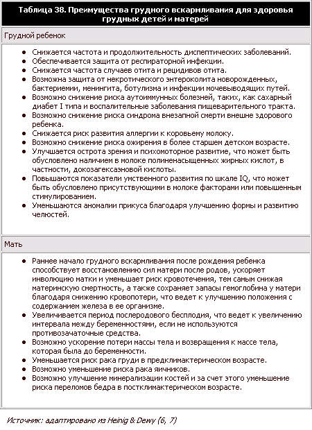 Помимо выгод пищевого характера, грудное молоко также дает грудным детям целый ряд преимуществ, не связанных с питанием (таблица 38). К ним относятся защита от различных острых и хронических инфекций и улучшение показателей физиологического и психического развития. Оценка этих положительных эффектов содержится в нескольких обзорных исследованиях (5, 6, 8), самые важные из которых резюмируются ниже. Инфекции