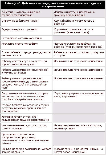 Сразу же после рождения здоровый младенец инстинктивно ищет пищу. В первые несколько часов жизни вне чрева матери ребенок оживлен, активен и готов к кормлению, поэтому в идеале грудное вскармливание следует начинать в течение первого часа. Для облегчения этого процесса нужно сохранять кожный контакт ребенка с матерью непосредственно с момента рождения и до окончания первого кормления. Следует поощрять матерей к тому, чтобы они как можно чаще находились со своими детьми в контакте «кожа к коже» и помогать им в этом в первые дни после родов, при этом мать и ребенок должны размещаться вместе в одной палате. Методы и порядки, помогающие и мешающие грудному вскармливанию, перечислены в таблице 40. Предпосылкой к правильному прикладыванию ребенка к груди, а значит и к выработке достаточного количества молока является правильное расположение тела ребенка. Если в первые несколько дней достигнуто правильное расположение и прикладывание к груди, большинства трудностей можно избежать. Ценная информация о прикладывании к груди и расположении тела ребенка, а также в целом о грудном вскармливании содержится в учебном курсе ВОЗ/ ЮНИСЕФ по консультированию по вопросам грудного вскармливания (61) и в практическом руководстве ВОЗ для медицинских работников (62). Ключом к установлению и поддержанию оптимальной лактации является кормление грудью по требованию ребенка. При условии, что ребенок правильно располагается у тела и прикладывается к груди, а мать кормит его грудью часто (8–12 раз в сутки), он будет, скорее всего, потреблять достаточное количество грудного молока. У разных детей разные схемы кормления, поэтому жесткие графики кормления не рекомендуются. В стационаре по-настоящему неограниченное кормление по требованию ребенка возможно только в том случае, когда мать и ребенок располагаются в одной палате, что позволяет матери откликаться, когда ее ребенок показывает признаки готовности к кормлению. Грудные дети не сосут непрерывно, а матери нередко неверно истолковывают паузы в сосании как знак того, что ребенок прекратил кормление, тогда как на самом деле это означает, что молоко продолжает течь и кормление проходит хорошо. Кормление под руководством ребенка, при котором грудному ребенку разрешается произвольно откидываться от груди, если он удовлетворен и сам решает больше не брать грудь, когда ему через несколько минут ее предлагают, обеспечит наилучшую выработку молока. Преждевременный отъем ребенка от груди – распространенная в некоторых местах привычка – может уменьшить количество съеденного молока, сделать детей голодными и без нужды заставить матерей сомневаться в достаточности выработки у них молока. Если ребенку дать возможность высосать первую грудь до того, как предлагать другую, это гарантирует получение ребенком оптимальных количеств высококалорийного позднего молока. Выработка грудного молока очень точно настраивается на удовлетворение потребности ребенка, и в целом ряде исследований была продемонстрирована положительная взаимосвязь между частотой кормления грудью и выработкой молока при частичной лактации (63). Частота и полнота отсасывания молока – это важные локальные сигналы регулирования выработки молока, действующие независимо от системных гормонов, таких, как пролактин. Считается, что нак