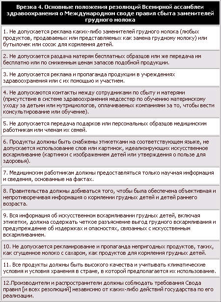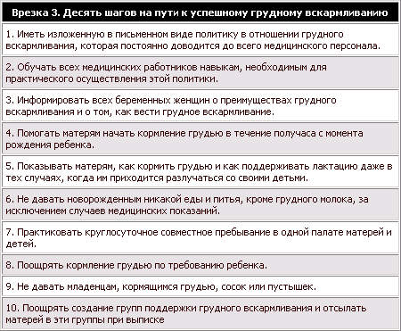 Существующая сегодня практика работы в лечебных учреждениях нередко вступает в противоречие с реко– мендациями о том, как лучше всего добиться успешного грудного вскармливания. Представленные во врезке 3 «Десять шагов на пути к успешному грудному вскармливанию» образуют фундамент Инициативы «Больница, доброжелательная к ребенку», которая была широко начата ЮНИСЕФ и ВОЗ в 1992 г. (73). В них кратко излагаются принципы работы родильных домов и отделений, необходимые для создания благоприятных условий для женщин, желающих кормить своих детей грудью, и достижения таким образом улучшений в распространенности и продолжительности грудного вскармливания. Инициатива также запрещает поставлять в больницы бесплатные и дешевые детские питательные смеси и требует прекратить деятельность по рекламированию и пропаганде детских питательных смесей и искусственного вскармливания. Для того чтобы стать больницей, доброжелательной к ребенку, каждое учреждение, принимающие участие в родовспоможении и охране материнства и уходе за новорожденными, должно осуществить на практике эти десять шагов. Стремясь усилить эту инициативу, Сорок пятая сессия Всемирной ассамблеи здравоохранения в 1992 г. призвала государства-члены к тому, чтобы они поощряли и поддерживали все государственные и частные медицинские учреждения, предоставляющие услуги по родовспоможению и охране материнства, в превращении их в «доброжелательные к ребенку». Необходимо признать, что матери, которые решили не кормить грудью, тоже получат пользу от доброжелательных к ребенку принципов работы, например, близкий кожный контакт, совместное пребывание в одной палате и кормление ребенка по требованию. Влияние реализации Инициативы на продолжительность грудного вскармливания и на распространенность инфекции было изучено в ходе крупномасштабного исследования в Беларуси (M.S. Kramer, личное сообщение, 1999 г.). Большинство больниц было произвольно распределено по двум группам: там, где реализуется Инициатива, и там, где сохраняются традиционные принципы работы. Центральное место в реализации целей Инициативы «Больница, доброжелательная к ребенку» занимает подготовка и повышение квалификации. Ожидается, что весь персонал больницы и все социальные работники, работающие с населением, будут проявлять положительное отношение к грудному вскармливанию и смогут давать согласованные и точные консультации и советы на языке, доступном и понятном для родителей. На решение женщины кормить ребенка грудью значительное влияние оказывают медицинские работники, и матери должны получать постоянную поддержку, ободрение и советы в их решении кормить грудью, причем решимость кормить грудью может сохраняться и в течение второго года жизни и дольше, в соответствии с нынешними рекомендациями ВОЗ/ЮНИСЕФ. Имеются данные, которые совершенно четко показывают, что противоречивые советы, даваемые медиками, сопровождаются ранним прекращением грудного вскармливания. Для того чтобы гарантировать согласованность и непротиворечивость информации, необходимо с помощью родителей выработать местную политику в отношении питания детей. Кроме этого, к правительствам был обращен призыв осуществить положения Международного свода правил сбыта грудного молока (74) и последующих резолюций Всемирной ассамбле