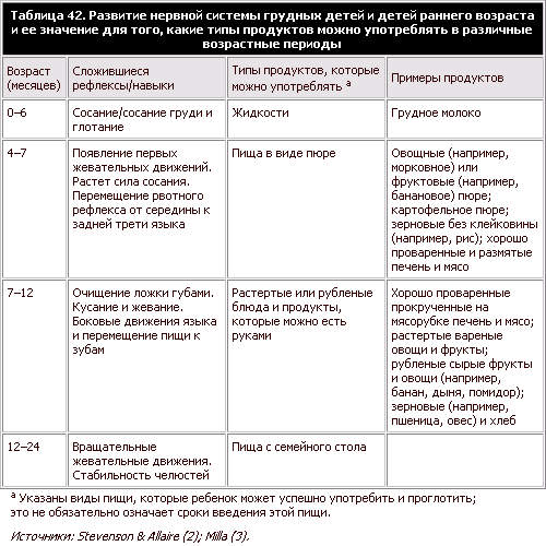 На сроки введения «твердой» пищи и на способность грудных детей потреблять ее влияет созревание нервно-мышечной координации. Многие пищевые рефлексы, проявляющиеся на разных стадиях развития, либо облегчают, либо затрудняют введение разных видов пищи. Например, при рождении грудное вскармливание облегчается благодаря и рефлексу захватывания груди, и механизму сосания и глотания (1, 2), но введению твердой пищи может мешать рвотный рефлекс. До 4 месяцев у грудных детей еще нет нервно-мышечной координации для того, чтобы сформировать пищевой комок, переправить его в ротовую часть глотки и проглотить. Еще не развиты управление движениями головы и опора позвоночника, и поэтому грудным детям трудно сохранять положение для успешного поглощения и проглатывания полутвердой пищи. Примерно в 5 месяцев дети начинают подносить ко рту предметы, и развитие в это время “рефлекса жевания” позволяет потреблять некоторые твердые продукты независимо от появления зубов. К возрасту примерно 8 месяцев большинство детей могут сидеть без поддержки, появляются первые зубы, и они обладают достаточной гибкостью языка, чтобы проглатывать более твердые комки пищи. Вскоре после этого у грудных детей вырабатываются навыки манипулирования для самостоятельного кормления, питья из чашки, держа ее двумя руками, и они могут есть пищу с семейного стола. Очень важно поощрять детей к тому, чтобы они на соответствующих этапах вырабатывали навыки приема пищи, такие, как жевание и поднесение предметов ко рту. Если эти навыки не будут приобретены вовремя, позже могут возникнуть проблемы поведения и кормления. Некоторые из этих рефлексов и возрастных навыков внутриротовых движений перечислены в таблице 42 вместе с возможными типами продуктов, которые можно, благодаря этим рефлексам и навыкам, употреблять без опаски. Продукты, перечисленные в таблице 42, являются примерами, и это не единственные продукты, которые можно вводить в рацион питания на различных описанных здесь этапах развития. Более того, между типами продуктов и развитием нервной системы нет никакой жесткой зависимости; просто ребенок физически более способен обращаться с данным продуктом на данном этапе развития. Пищеварение и всасываниеУ грудных детей секреция желудочных, кишечных и панкреатических пищеварительных ферментов не развита так, как у взрослых. Тем не менее, грудной ребенок способен полностью и эффективно переваривать и всасывать пищевые вещества, содержащиеся в грудном молоке, а в грудном молоке содержатся ферменты, которые способствуют гидролизу жиров, углеводов и белков в кишечнике. Аналогичным образом, в раннем грудном возрасте секреции солей желчных кислот лишь едва хватает для образования мицеллы, а эффективность всасывания жира ниже, чем у детей более старшего возраста и взрослых. Эту недостаточность может отчасти компенсировать присутствующая в грудном молоке, но отсутствующая в детских питательных смесях промышленного производства липаза, стимулируемая солями желчной кислоты. Примерно к 4 месяцам желудочная кислота помогает желудочному пепсину полностью переваривать белок. Хотя панкреатическая амилаза начинает вносить полноценный вклад в переваривание крахмалов только в конце первого года, большинство прошедших тепловую обработку крахмалов перевариваются