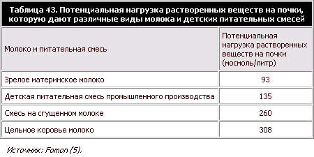 Нагрузка растворенных веществ на почки означает суммарное количество растворенных веществ, которое должно быть выведено почками. В основном она включает нетрансформируемые в ходе обмена веществ пищевые компоненты, главным образом, электролиты натрий, хлор, калий и фосфор, которые были поглощены сверх потребностей организма, и конечные продукты обмена веществ, наиболее важными из которых являются азотные соединения, образовавшиеся в результате пищеварения и метаболизма белков. Потенциальная нагрузка растворенных веществ на почки означает растворенные вещества пищевого и эндогенного происхождения, которые необходимо будет вывести с мочой, если они не будут использованы в синтезе новой ткани или выведены непочечными путями. Она определяется как сумма четырех электролитов (натрия, хлора, калия и фосфора) плюс растворенные вещества, полученные в результате белкового обмена, на долю которых обычно приходится свыше 50% потенциальной нагрузки растворенных веществ на почки. В таблице 43 показаны значительные различия в потенциальной нагрузке растворенных веществ на почки, которую дают различные виды молока и детские питательные смеси. Новорожденный ребенок имеет слишком ограниченную пропускную способность почек, чтобы справляться с высокой нагрузкой растворенных веществ и одновременно сохранять жидкости. Осмолярность материнского молока соответствует возможностям организма ребенка, поэтому беспокойство по поводу чрезмерной нагрузки растворенных веществ на почки касается прежде всего детей, которые не кормятся грудью, особенно детей, которых кормят немодифицированным коровьим молоком. Особенно оправдано это беспокойство в период болезни. Примерно к 4 месяцам почечная функция становится значительно более зрелой, и грудные дети способны лучше сохранять воду и справляться с более высокими концентрациями растворенных веществ. Таким образом, рекомендации в отношении введения прикорма обычно не требуют того, чтобы их изменяли для приведения в соответствие со стадией развития почечной системы. Защитная системаЖизненно важным механизмом защиты является развитие и поддержание эффективного барьера слизистой оболочки в кишечнике. У новорожденного барьер слизистой оболочки незрелый, вследствие чего он не защищен от повреждения энтеропатогенными микроорганизмами и чувствителен к действию некоторых антигенов, содержащихся в пище. Грудное молоко содержит большой набор факторов, которых нет в детских питательных смесях промышленного производства и которые стимулируют развитие активных защитных механизмов и помогают подготовить желудочно-кишечный тракт к поглощению пищи переходного периода. К числу неим– мунологических защитных механизмов, помогающих защитить поверхность кишечника от микроорганизмов, токсинов и антигенов, относятся желудочная кислотность, слизистая оболочка, кишечные секреты и перистальтика. Относительно слабые защитные механизмы пищеварительного тракта грудного ребенка в раннем возрасте, а также пониженная желудочная кислотность увеличивают риск повреждения слизистой оболочки чужеродной пищей и микробиологическими белками, которые могут вызывать прямое токсическое или иммунологически опосредованное повреждение. Некоторые продукты содержат белки, которые являются потенциаль