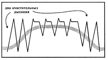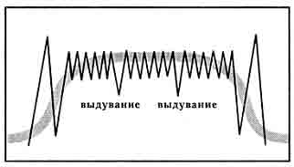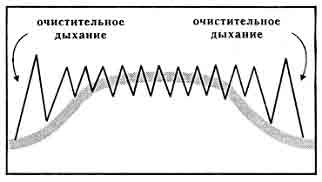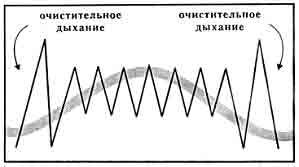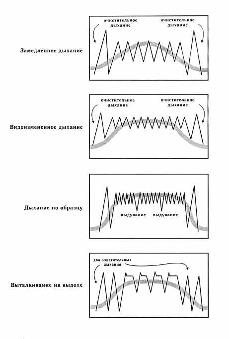 1. «Схватка начинается». 2. Два очистительных дыхания. 3. Вдохните, задержите дыхание до счета 7. 4. Расслабьте низ таза (по Кегелю). 5. Выталкивайте вниз (лифтовое упражнение, глава 2). 6. Выпустите воздух, откиньте голову назад, чтобы сделать еще один вдох и задержите дыхание до счета 7. Тужьтесь. 7. Продолжайте так действовать на протяжении всей схватки. 8. «Схватка заканчивается». 9. Два продолжительных очистительных дыхания, полностью расслабьтесь. Потуги на выдохеДругой метод дыхания, который используется на этапе изгнания плода, обычно называется «выталкивание на выдохе». Вместо задержки дыхания вам предлагается выдыхать его ровным устойчивым потоком. Представьте себе, что вы держите свечу на расстоянии вытянутой руки. Выдыхайте воздух, будто для того, чтобы устойчиво наклонять ее пламя. При выдыхании сожмите мышцы вашего живота и давите вниз. Сделайте еще одно дыхание и снова выдыхайте, напрягая мышцы живота и нажимая вниз. При использовании такого метода выталкивания вы будете при выдыхании воздуха издавать звук, какой обычно издают штангисты при подъеме своего снаряда. Такой звук вполне нормален и его следует ожидать в процессе родов. Образец дыхания при потугах на выдохе 1. «Схватка начинается». 2. Два очистительных дыхания. 3. Вдохните, затем медленно выпускайте воздух, сжимая мышцы живота (помните, что нужно расслабить таз и ягодицы). 4. Снова вдохните и все повторите. Продолжайте, пока не кончится схватка. 5. «Схватка заканчивается». 6. Два очистительных дыхания. Попробуйте оба типа дыхания при потугах и в разных положениях: лежа с приподнятой спиной, сидя на корточках с поддержкой, лежа на боку с поднятой вверх ногой, опирающейся на опору. Всегда помните о том, что нужно расслаблять низ таза. Когда вы действительно вступите в процесс родов, зрительно представляйте себе младенца, продвигающегося вниз по родовому каналу при каждой потуге. Медицинский персонал посоветует вам такой тип выталкивания, который может быть для вас наиболее эффективным. Примечание: когда головка вашего младенца окажется на выходе и будет готова выдвинуться, доктор может дать указание «прекратить выталкивание», чтобы младенец мог быть нежно проведен через отверстие. Дайте вашей голове откинуться и выдувайте воздух для преодоления позыва к потуге. Продолжайте выдувать воздух, пока схватка не прекратится. На последней неделе беременности практикуйтесь правильно тужиться и дышать каждый день. Избегайте тренировок, когда вы устали или сильно заняты. Начинайте каждое занятие с упражнений по расслаблению, затем проведите по три тренировочных «схватки», используя для облегчения состояния каждый из четырех образцов дыхания. С помощью устойчивых повторений ваш мозг научится реагировать на них особым образом. Для развития такой обусловленной реакции требуются частые повторения. На занятиях убедитесь, что вы действительно сосредотачиваетесь. Во время родов способность концентрироваться на запрограммированной деятельности изменит ваше восприятие схватки. Ниже еще раз приводятся четыре описанных образца дыхания при родовых схватках.