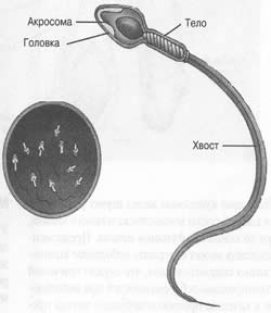 Яички очень чувствительны к давлению или прикосновению. Некоторые мужчины считают, что легкое поглаживание мошонки или нежное сжимание яичек во время сексуальной активности возбуждает, но многим другим неприятны прикосновения к этим органам. Яички выполняют две отдельные функции: вырабатывают гормоны и продуцируют сперму. Гормоны, прежде всего тестостерон, регулирующий развитие вторичных мужских половых признаков и играющий важную роль в сексуальных проявлениях и функциях, вырабатываются клетками Лейдига. Сперматозоиды формируются в семенных канальцах – микроскопических трубочках, свернутых в плотную спираль, общая длина которых достигает почти 500 м. В целом продукция сперматозоидов длится 70 дней. В отличие от женщины, у которой после рождения на свет не формируется новых яйцеклеток, в организме мужчины по достижении половой зрелости образование сперматозоидов происходит постоянно (миллиарды в год). Зрелый сперматозоид человека значительно мельче яйцеклетки; его длина достигает 0,06 мм, а по объему он в тысячи раз меньше яйцеклетки. Сперматозоид можно увидеть только под микроскопом; он состоит из трех частей: головки, тела и хвоста (рис. 3.14). Головка сперматозоида содержит генетический материал, т.е. хромосомы, и акросому, представляющую собой химический "резервуар" мужской половой клетки. Тело сперматозоида обеспечивает эту клетку энергией, которая необходима для движения, происходящего с помощью хвоста.