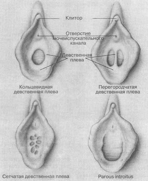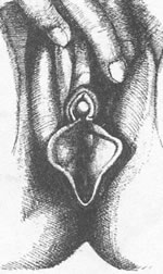Рис. 3.3 Строение клитора Клитор часто рассматривают как миниатюрный пенис, однако это сексуально окрашенное и неверное представление. Клитор не участвует ни в размножении, ни в мочеиспускании; он не удлиняется, в отличие от полового члена, при стимуляции, хотя тоже переполняется кровью. В процессе эмбрионального развития клитор и половой член образуются из одного и того же зачатка. Величина и внешний вид клитора сильно варьируют, однако нет никаких данных, которые указывали бы на то, что большие размеры клитора способны создать более сильное сексуальное возбуждение. Вопреки мнению некоторых врачей, мастурбация редко приводит к увеличению этого органа. Считается, что обрезание клитора – хирургическое удаление крайней плоти – усиливает сексуальную реактивность женщины, поскольку при этом становится возможным стимулировать головку клитора более непосредственно1. Мы полагаем, однако, что такая практика может помочь лишь в редких случаях, поскольку она имеет два больших недостатка: 1) головка клитора часто бывает слишком чувствительна к прямому прикосновению, которое иногда вызывает даже боль или раздражение (в этом смысле крайняя плоть несет защитную функцию), и 2) во время полового акта введение полового члена во влагалище косвенным образом стимулирует клитор, приводя в движение малые половые губы, в результате чего крайняя плоть трется о головку клитора (Masters, Johnson, 1966). Некоторые сексологи рекомендуют для повышения сексуальной реактивности женщин менее радикальный способ, чем обрезание: с помощью зонда ослабляют адгезию между крайней плотью и головкой клитора или удаляют уплотнившуюся препуциальную смазку (смегму) (Graber, Kline-Graber, 1979). Мы встретились с очень небольшим числом случаев, в которых было необходимо такое вмешательство, и продолжаем скептически относиться к широкому применению этой процедуры. Некоторые племена в Африке и Южной Америке практикуют хирургическое удаление клитора (клиторэктомию) как ритуальный обряд по достижении половой зрелости. По свидетельству одного врача в Египте до сих пор некоторых молодых девушек подвергают этой болезненной процедуре (Sexuality Today, № 3, 6 июня 1983). Хотя эту операцию называют "обрезанием клитора", по сути это совсем не то. Клиторектомия не нарушает половое возбуждение или оргазм, но и не способствует их усилению. Именно по этой причине большинство женщин при мастурбации лишь поглаживают область вокруг головки клитора, избегая непосредственного его стимулирования. По-видимому, сторонники обрезания клитора (как ни странно, это обычно бывают мужчины) не уделили должного внимания данному обстоятельству. ПромежностьПромежностью (perineum) называют лишенную волосяного покрова область между задней частью половых губ и анальным отверстием (выходное отверстие прямой кишки). Этот участок нередко бывает чувствителен к прикосновению, надавливанию, температуре и может быть источником полового возбуждения. Девственная плеваВход во влагалище прикрыт тонким слоем ткани – девственной плевой (hymen). В девственной плеве, функции которой неизвестны, обычно имеются отверстия, через которые выделяется кровь во время менструации. Плева прикрывает вход во влагалище не полностью и варьирует по форме, размерам и толщине (рис. 3.4).