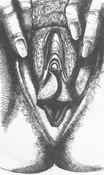 Рис. 3.2 Некоторые вариации во внешнем виде половых органов женщины Рисунки Бетти Додсон отражают не только ее художественное видение, но и феминистское представление о том, сколь важно женщинам воспринимать свою сексуальную анатомию как нечто положительное, как источник наслаждения, а не стыда (Betty Dodson "Selflove and Orgasm", 1983). Бартолиновы железы расположены в малых половых губах; каждая из них имеет небольшой проток, открывающийся на внутренней поверхности губы, вблизи преддверия влагалища. Некогда считалось, что эти железы играют главную роль в выработке смазки влагалища, однако теперь установлено, что те несколько капель секрета, которые они обычно выделяют при сексуальном возбуждении, лишь слегка увлажняют половые губы. КлиторКлитор, одна из самых чувствительных областей женских половых органов, расположен там, где сходятся верхушки малых половых губ. Головка клитора напоминает маленькую блестящую пуговку. Чтобы ее увидеть, надо осторожно отодвинуть крайнюю плоть (кожу), покрывающую клитор. Тело клитора (corpus clitoris) состоит из губчатой ткани, образующей две длинные ножки (crura) в форме перевернутой буквы V. Ножки направлены к тазовым костям (рис. 3.3). Клитор богат нервными окончаниями, что делает его очень чувствительным к прикосновению, надавливанию и температуре. Это уникальный орган, единственная известная нам функция которого заключается в том, чтобы концентрировать и накапливать сексуальные ощущения женщины (Masters, Johnson, 1970).