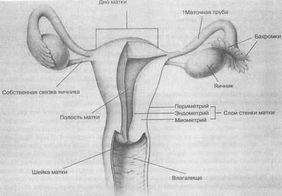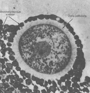 Рис. 3.6 Внутреннее строение женских половых органов (вид спереди; матка и влагалище частично удалены) Яйцеводы (маточные трубы)Маточные трубы, или яйцеводы начинаются от матки и достигают в длину примерно 10 см (рис. 3.6). Дистальные концы маточных труб имеют форму воронки, от краев которой отходят пальцевидные выросты (fimbria), нависающие над яичниками. Внутренняя выстилка маточных труб образована длинными тонкими складками ткани, покрытой ресничками. Освобождающиеся из яичников яйцеклетки попадают в маточные трубы, где и происходит встреча между яйцеклеткой и сперматозоидом. ЯичникиЯичники (ovaries), или женские гонады, представляют собой парные органы, расположенные по обе стороны матки. По величине яичники можно сравнить с миндальными орехами в скорлупе (примерно 3 х 2 х 1,5 см); они удерживаются на месте соединительной тканью, которая прикрепляется к широкой связке матки. Яичники выполняют две функции: вырабатывают гормоны (самые главные из них – эстрадиол и прогестерон) и продуцируют яйцеклетки. Еще до рождения девочки в ее формирующихся яичниках начинается развитие будущих яйцеклеток. Примерно на 5-6 месяцах беременности яичники плода содержат 6-7 млн. будущих яйцеклеток, большая часть которых атрезируется до рождения девочки. В яичниках новорожденной содержится примерно 400 000 незрелых яйцеклеток; в дальнейшем никаких новых яйцеклеток не образуется. В детском возрасте атрезия продолжается, и число яйцеклеток уменьшается еще больше. Незрелые яйцеклетки окружены тонким слоем клеток, образующих фолликул. При наступлении полового созревания у девочек начинаются менструации (см. гл. 7); в каждом менструальном цикле происходит созревание нескольких яйцеклеток, в процессе которого эти клетки делятся дважды, причем количество содержащегося в них генетического материала уменьшается вдвое. В результате этого процесса, называемого мейозом, каждая незрелая яйцеклетка делится на четыре клетки, из которых только одна образует зрелую, способную к оплодотворению яйцеклетку (ovum). Зрелая яйцеклетка достигает 0,135 мм в диаметре и окружена блестящей оболочкой – zona pellucida (рис. 3.7). Яйцеклетка человека очень мала, она меньше точки, стоящей в конце этого предложения. Функции трех других клеток, называемых полярными тельцами, неясны; известно, что в конце концов они дегенерируют.