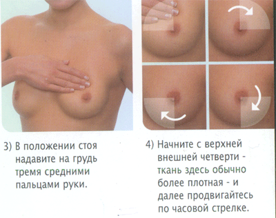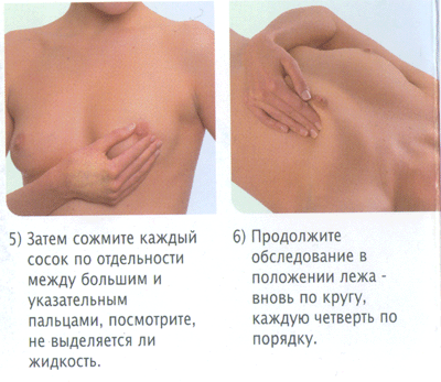 Осмотр молочных желез лучше проводить мыльной рукой в ванной или под душем. 1. Станьте перед зеркалом прямо. Внимательно осмотрите свои грудные железы. Обратите внимание нет ли каких-либо выпячиваний, втяжений или других нарушений формы груди. 2. Теперь повернитесь вполоборота направо – осмотрите левую грудь. 3. Далее повернитесь вполоборота налево – осмотрите правую грудь. 4. Заложите руки за голову и в этом положении осмотрите обе грудные железы. 5. Правой ладонью плашмя ощупайте левую грудную железу – нет ли затвердений, опухоли. 6. Если грудь больших размеров, то необходимо поддержать ее снизу: левой рукой левую грудь, правой – правую, а ладонью противоположной руки плашмя ощупать попеременно грудные железы. 7. Теперь лягте, правую руку заложите за голову, а ладонью левой руки ощупайте правую грудь. Подобным образом при обследовании левой груди. При обследовании молочных желез обращайте внимание на следующие моменты: Имеются ли боли в грудных железахСвязаны ли боли с менструациямиИмеются ли патологические выделения из сосков– Эти выделения: серозные кровянистые бурые Соски обеих грудных желез расположены на одном уровне или на разных– При поднятии рук вверх один сосок становится выше другого – Имеется ли втянутый сосок в покое – Втянутый сосок существует много времени – Втянутость соска произошла сравнительно недавно – Происходит ли втяжение соска при поднятии рук вверх Имеются ли на грудных железах:втянутые участки кожи отек типа лимонной корки красноватые или синеватые пятна – При ощупывании грудных желез обнаружены: уплотнения гладкие подвижные узлы продолговатые уплотнения, тяжи опухолеподобные образования плотные бугристые опухолевые образования Имеются увеличенные лимфатические узлы:над ключицей в подмышечной впадине Эти узлы: мягкие плотные одиночные множественные подвижные неподвижные спаянные между собой спаянные с кожей Алгоритм любезно предоставлен сайтом http://www.all-about-cancer-prevention.com/anketa-fem_2.html Незадолго до начала менструации у большинства женщин грудь значительно более напряжена, чем в остальное время, у 2\3 даже болезненна. Однако в первые дни после начала менструации все нормализуется. Это нормальное течение предменструального синдрома. Что бы подозрительного Вы ни нащупали, не ставьте себе сами диагноз – сходите к маммологу или сделайте в начале хотя бы УЗИ молочных желез, если Вам до 35 лет, и маммографию, если больше. УЗИ молочных желез делается на 5-8 день цикла. _________________________________См. также разделы: Прочесть книгу (Основы половой жизни, Родить и возродиться, Культура семейных отношений, Роды без страха и др) Подготовка к родам – методика Ламаза Инфекции во время беременности Показания и противопоказания к приему гормональной контрацепии Лекарства – показания и противопоказания к применению во время беременности и кормления грудью, и другие разделы сайта