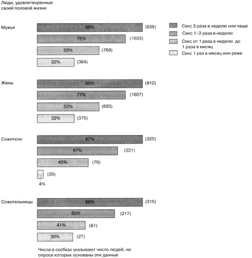 1 – Данные Кинзи относятся к супружеским парам, принадлежащим к белой расе и имеющим высшее образование; цит. по Gebhard, Johnson (1979). 2 – Данные Ханта (Hunt, 1975) относятся к супружеским парам белой расы. Сексуальное удовлетворениеКакое влияние оказывает удачный брак на сексуальное удовлетворение супругов? Какое отношение имеет характер сексуальной жизни супружеской пары к их удовлетворенности своим браком в целом? На такие вопросы можно ответить лишь частично, поскольку научные данные здесь сравнительно немногочисленны. Сообщения самого Кинзи не содержали оценок зависимости между сексуальным соответствием партнеров и их счастьем в браке, однако анализ его данных, проведенный впоследствии (Gebhard, 1966), позволил сделать вывод, что вероятность достижения оргазма женшиной в "очень счастливых" браках (по оценкам самих опрошенных) выше, чем в остальных. Остается неясным, достигалась ли удовлетворенность сексуальными отношениями благодаря очень счастливому браку, или наоборот. Данные из обзора в "Плейбой" показывают, что преобладающее большинство женатых мужчин и замужних женщин, описывающих свой супружеский секс как доставляющий большое удовольствие, оценивали свои брачные отношения с мужем (женой) как очень близкие (Hunt, 1975). Среди тех, кто считал свой супружеский секс неприятным или недоставляющим удовольствия, никто не назвал отношения с мужем (женой) очень близкими. Интересно отметить, что среди супругов, оценивающих свои отношения как неблизкие или отчужденные, 59% мужчин и только 38% женщин называли супружеский секс "по большей части" или "очень" приятным. Очевидно, мужчины чаще, чем женщины, способны получать от секса удовольствие при натянутых отношениях между супругами. В обзоре журнала "Редбук" (Levin, 1975) показана корреляция между частотой половых сношений и удовлетворенностью ими женщины. Отмечено также, что 81% женщин, достигавших оргазма всегда или в большинстве случаев, оценивали свой брак в сексуальном аспекте как удачный или очень удачный, а среди женщин, достигавших оргазма лишь изредка или не достигавших его никогда (или не знавших, испытывают ли они оргазм), считали свои сексуальные отношения хорошими лишь 52 и 29%, соответственно. Обнаружена также тесная корреляция между способностью жены говорить своему мужу о своих сексуальных желаниях и ощущениях и качеством супружеского секса. В последующем (Blumstein, Schwartz, 1983) зависимость между частотой половых сношений и сексуальным удовлетворением была подтверждена (рис. 15.2). Среди супружеских пар, имевших половые сношения трижды в неделю или чаще, 89% мужей и жен были удовлетворены своей половой жизнью, тогда как при частоте коитусов от одного раза в неделю до одного раза в месяц удовлетворенных было 53%, а при еще меньшей частоте – лишь 32%. Другим важным фактором, связанным с сексуальным удовлетворением, было равноправие в инициации полового акта или отказа от него. Среди мужей и жен, сообщивших о своих равных правах в этом отношении, удовлетворенных качеством половой жизни было 80%, тогда как в браках, где инициатива принадлежала лишь одной стороне – 66%. Что касается отказа от полового акта, то при равноправии в этом отношении удовлетворенные качеством половой жизни составляли 80% мужей и жен, а при отсутствии равноправия – 58% мужей и 61% жен.