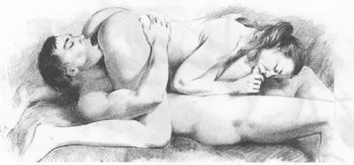 В этом положении партнеры лежат бок о бок, обратившись лицом друг к другу. Поскольку ни один из них не обременен весом другого, это очень вольное положение, допускающее всевозможные неспешные ласки и объятия. У обоих партнеров по крайней мере одна рука свободна. Главный недостаток такого положения – некоторая трудность введения полового члена во влагалище. Поэтому многие пары начинают половой акт в каком-нибудь из других положений лицом к лицу, а затем поворачиваются на бок. Есть и два других недостатка: во-первых, половой член гораздо чаще выскальзывает из влагалища, чем при других положениях, а, во-вторых, трудно производить энергичные движения тазом. Время, место, темп и другие детали