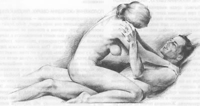 Другое популярное положение – женщина сверху. В этом положении она либо сидит, либо лежит на своем партнере, причем в отличие от положения "мужчина сверху" она имеет возможность в значительной степени регулировать движения, глубину проникновения и темп. Она может ласкать партнера, а у него свободны руки, и он тоже может гладить ей руки, грудь, гениталии и другие части тела; визуальная стимуляция и отсутствие необходимости поддерживать свой вес при этом положении вдохновляют мужчину на такие ласки. Вообще положение "женщина сверху" – наилучшее для мужчины, желающего контролировать эякуляцию. Это положение чаще всего используется при сексотерапии в случаях затруднений с достижением оргазма у женщины, поскольку оба партнера имеют возможность проводить мануальную стимуляцию клитора. Оно удобно также на поздних сроках беременности. Отметим некоторые недостатки этого положения. Оно не нравится парам, привыкшим думать, что мужчина "всегда" должен быть сверху. Находясь над мужчиной, женщина занимает ведущую, как бы "агрессивную" позицию и некоторые мужчины видят в этом угрозу своему мужскому достоинству. В чисто практическом плане некоторые мужчины считают, что в этом положении им трудно совершать фрикции. При положении "женщина сверху" очень важно правильно вводить половой член. Женщине никогда не следует удерживать эрегированный половой член под прямым углом к телу мужчины и пытаться сесть на него, так как это может оказаться неприятно одному или другому партнеру. Половой член должен располагаться под углом от 45 до 60° (в направлении к голове мужчины), поскольку это соответствует углу наклона влагалища, когда женщина наклонена вперед; в таком случае она сможет соскользнуть назад, на член. После небольшой практики это становится просто. Введение сзади.