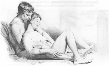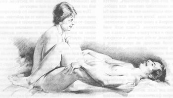 Положения, рекомендуемые партнерам для упражнений по фокусированию ощущений. Вверху – положение, при котором прикосновения совершает мужчина, а внизу – когда этим занимается женщина. Партнерам настоятельно советуют выбирать удобные для них позы На этой стадии партнерам обычно предлагают испробовать метод "рука на руку" как более непосредственный способ коммуникации без слов. Партнеры проделывают это упражнение по очереди. Положив руку на руку своего партнера в то время, когда другой рукой он прикасается к ее телу, женщина может дать ему почувствовать, хочется ли ей, чтобы он надавливал сильнее или слабее, гладил быстрее или медленнее или же перешел бы на другой участок тела. Затем все это повторяется с мужчиной, который в свою очередь сигнализирует о своих предпочтениях. Смысл всей этой процедуры состоит в интеграции молчаливых посланий таким образом, чтобы партнер, к которому прикасается другой партнер, не превращался в "регулировщика уличного движения", а просто вносил некоторый дополнительный вклад в процесс прикосновений, производимый в первую очередь исходя из интересов "прикасающегося" партнера. На следующей стадии обучения фокусированию ощущений мужчине и женщине предлагают прикасаться друг к другу не по очереди, а одновременно. Это имеет две цели: во-первых, создается естественная форма физического взаимодействия ("в жизни" люди обычно не прикасаются друг к другу по очереди); во-вторых, это удваивает потенциальные источники чувственного вклада. Эта стадия имеет очень важное значение для преодоления стремления к самонаблюдению, поскольку единственное, что может сделать наблюдатель, это переключить внимание на какую-то часть тела своего партнера (погрузиться в прикосновение) и совершенно отвлечься от наблюдения за собственной реакцией. Партнерам напоминают, что какого бы сильного возбуждения они не достигли, половой акт все еще остается под запретом. При последующих упражнениях по фокусированию ощущений продолжаются те же действия, но в какой-то момент партнеры переходят в положение "женщина сверху" без попыток введения полового члена во влагалище. В этом положении женщина может играть с половым членом, потереть его о клитор, вульву или отверствие влагалища, независимо от того, находится ли он в эрегированном состоянии или нет. Если возникнет эрекция и если ей захочется, она может ввести кончик члена во влагалище, но при этом все ее мысли должны быть сосредоточены на физических ощущениях, с тем чтобы сразу прекратить свои действия или вернуться к простым прикосновениям или объятиям, не затрагивающим гениталии, если у нее или у ее партнера проявится стремление к половому акту или какое-то беспокойство. После того как партнеры начинают чувствовать себя достаточно уверенно на этом уровне, настоящее половое сношение обычно не вызывает трудностей. Все подобные приемы могут показаться очень простыми, однако важно понять, что все это лишь составные элементы тщательно разработанной программы психотерапии, а не просто набор каких-то трюков или фокусов. Самое главное их достоинство состоит в быстром и эффективном действии даже в тяжелых и запущенных случаях. Некоторые особые лечебные стратегииОписанная выше в общих чертах схема лечения, применяемая Мастерсом и Джонсон, дополняется некоторыми другими метода